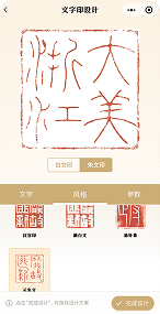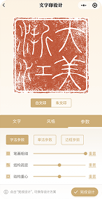 提供多种风格,如汉官印、满白文、悬针篆、元朱文,8个参数可调整,9000+标准篆字数据库,100000+风格篆字数据库,调整参数后开始雕刻。
